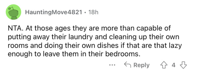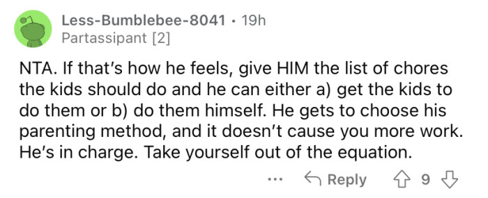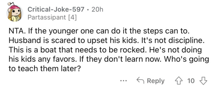 The OP's husband says it will be easy enough for the kids to learn those responsibilities later in life. Keep scrolling to see how people reacted.