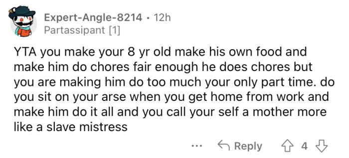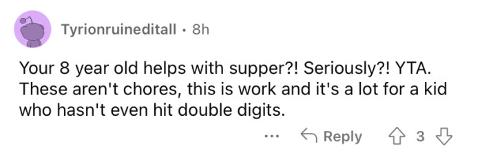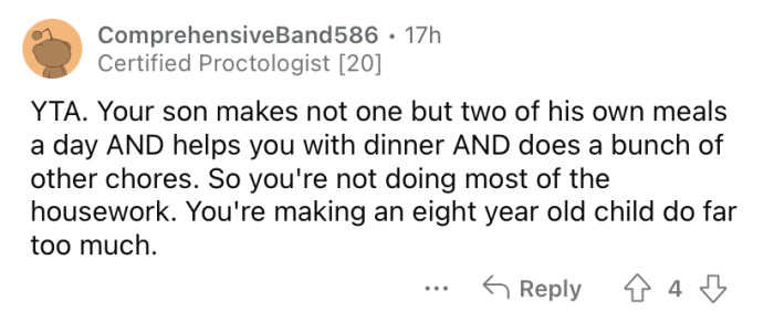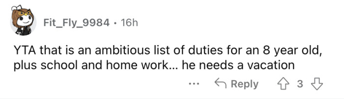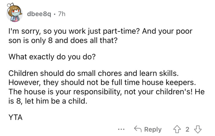Reddit/unhappybathroom7448She explained that her 8-year-old son does A LOT of chores for himself and the household.