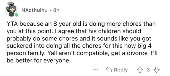 You see, the OP explained that she has an 8-year-old son with her ex-husband, and her current husband has two children with his ex-wife. The Redditor says her son is very helpful and independent, doing a large amount of the household chores.