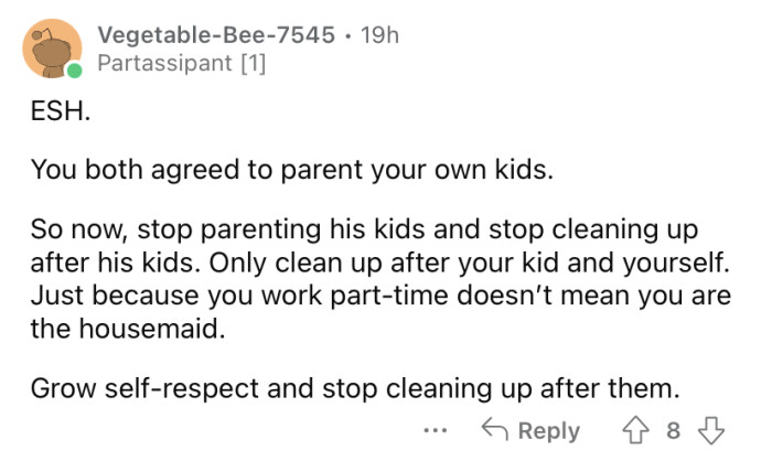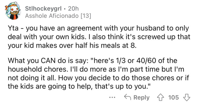 The OP also explained that she and her husband mostly "raise their own kids" and don't interfere with each other's parenting decisions. She says she has a good relationship with her husband's kids, but if she asks them to help out with chores, it can be hit-or-miss as to whether or not they will agree.