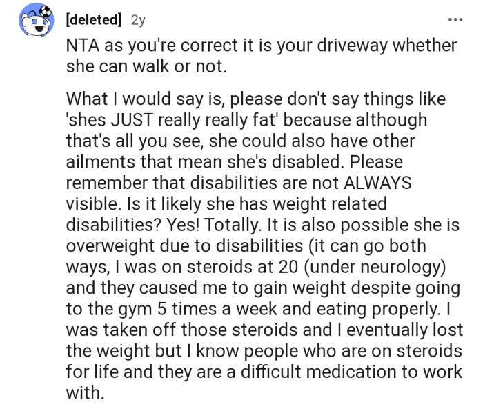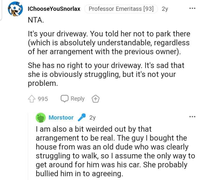 The Reddit community is solidly behind OP on this matter. They have reiterated that it's their driveway, and they have the right to decide who uses it.