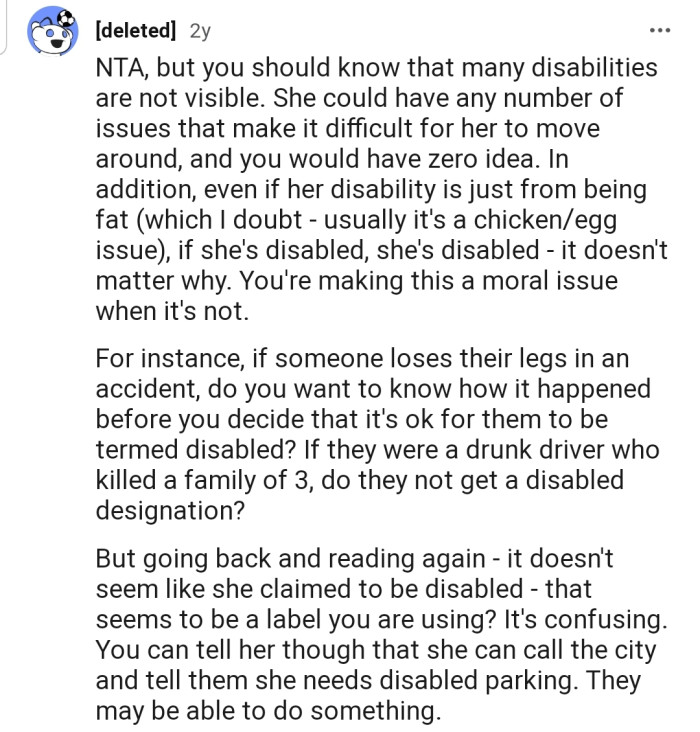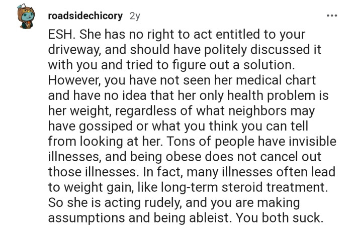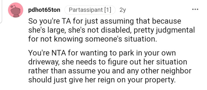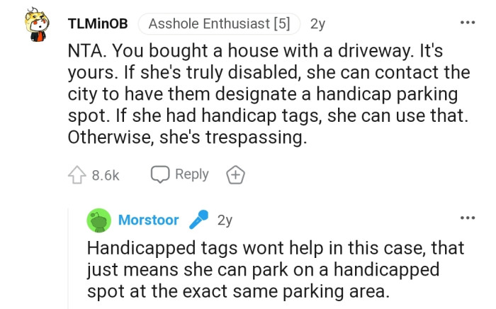 The commenters have also pointed out that she missed the opportunity to negotiate politely with OP about using their driveway. Regardless, she has been advised to contact the city to have them designate a disabled parking spot for her.