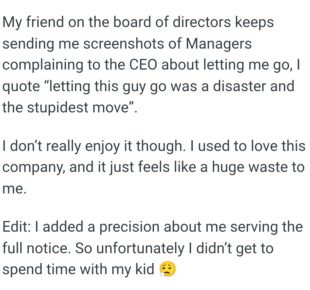Want some more satisfaction? I just learned the CEO got fired during a global company meeting, and the board of directors said, quote, « we’re sorry we acted too late ».Furthermore, the psychological principle of cognitive dissonance plays a significant role in such situations. When employees' values conflict with their organization's practices, it can lead to discomfort and the eventual decision to resign.