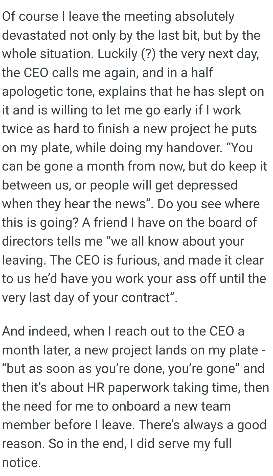 I wanted to leave a toxic company; the CEO took it personally and decided to play me, postponing the end of my contract again and again. So I made sure I would not be the only one leaving.They think they are in control