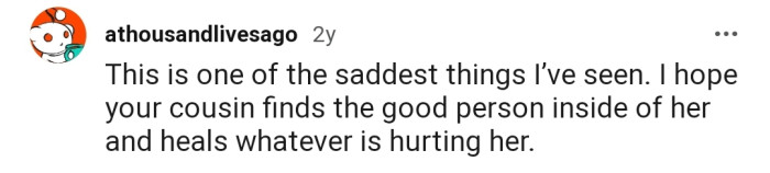 If OP's cousin has a boyfriend, we hope that he gets to see just how inconsiderate she is. No one deserves to go through such abuse in their relationship.