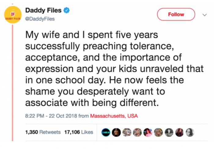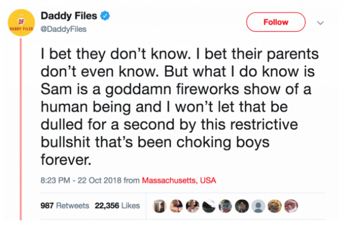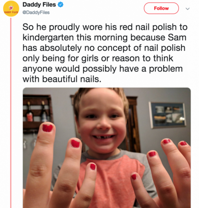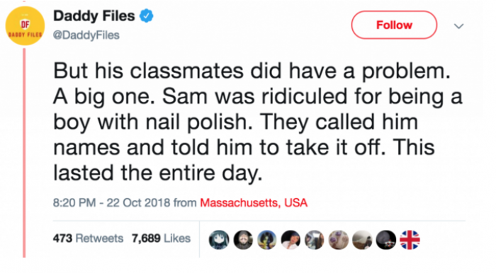 Aaron works at a PR firm and also runs a parenting blog called "Daddy Files." He begins by explaining that Sam is what the world calls a "proper boy." He is a dirty-handed, truck-loving, sporty kid. However, he also makes choices that make him feel good. Regrettably, the world cannot understand those choices.