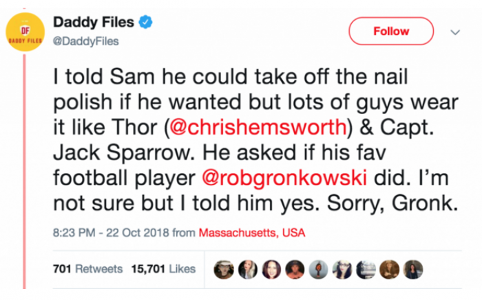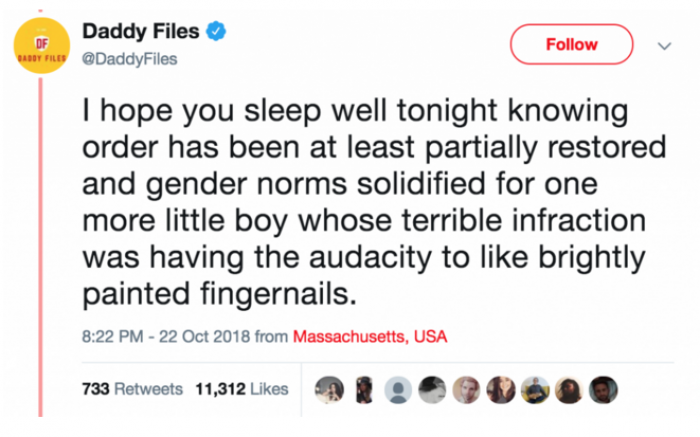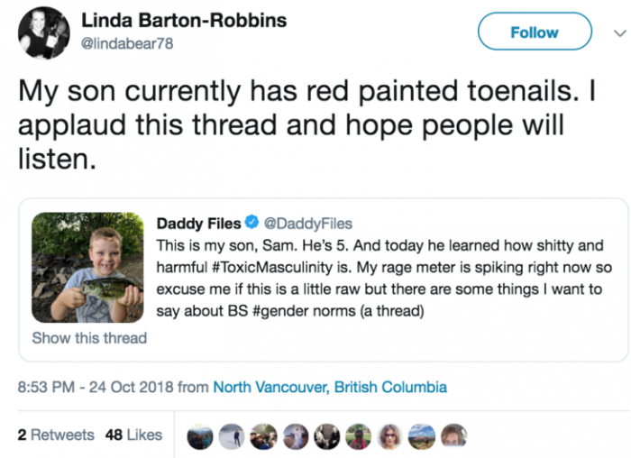 “This is my son, Sam. He’s 5. And today he learned how harmful and damaging #ToxicMasculinity is. My rage meter is spiking right now, so excuse me if this is a little raw, but there are some things I want to say about BS #gender norms (a thread)” As Dr. Alexandra Solomon states, “Toxic masculinity is a societal issue that harms not just men, but everyone who interacts with them.”
