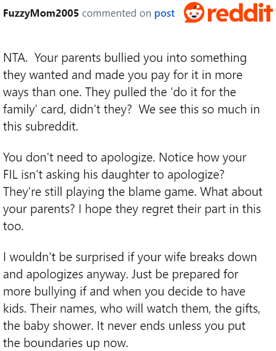 Here’s a story from the "Am I The A**hole?" (AITA) subreddit that illustrates what can happen when couples allow their parents to take over. The original poster (OP) married his wife, whom he loves dearly.