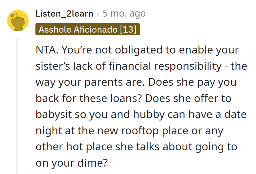 RedditAt dinner, her sister asked for a loan to try a new rooftop place, but she declined, suggesting financial responsibility.