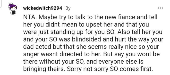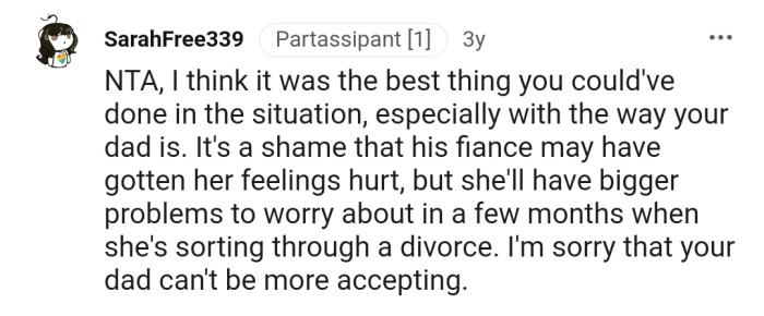 Although OP’s siblings agreed with her decision, they weren’t too happy about their father’s fiancée getting caught in the crossfire. This made OP question her actions and ask the ultimate AITA question.