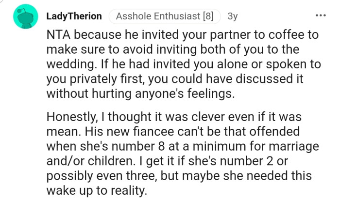 "His new fiancée can't be that offended when she's number 8 at a minimum for marriage and/or children."