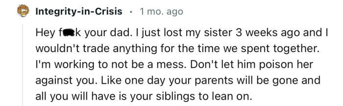 "Don't let him poison her against you. One day your parents will be gone, and all you will have is your siblings to lean on."