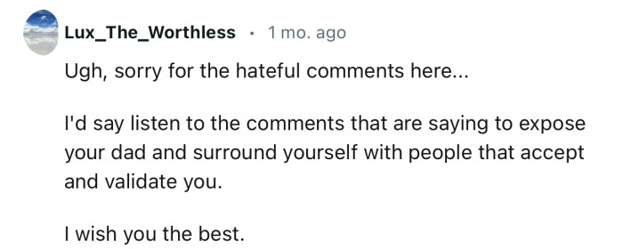 The Reddit community has also rallied behind OP to offer much-needed support. The commenters have encouraged them to tell the world the truth about their dad, as well as surround themselves with those who truly care for them.
