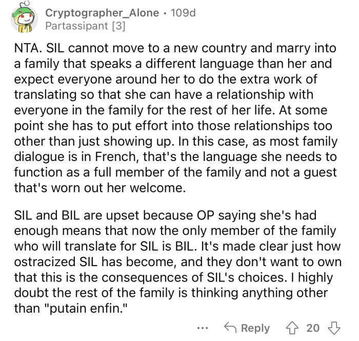Reddit: r/AmItheA**holeThe SIL never bothered learning French despite living in Belgium for eight years.
