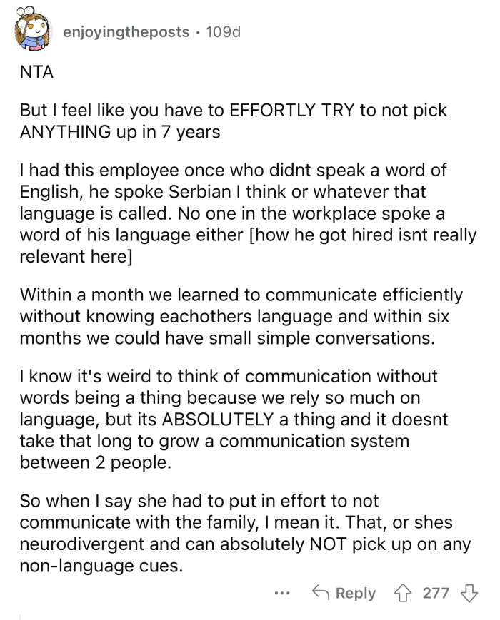 Reddit: r/AmItheA**holeThe SIL doesn't usually need translation except when their family spends time with their husbands' parents.