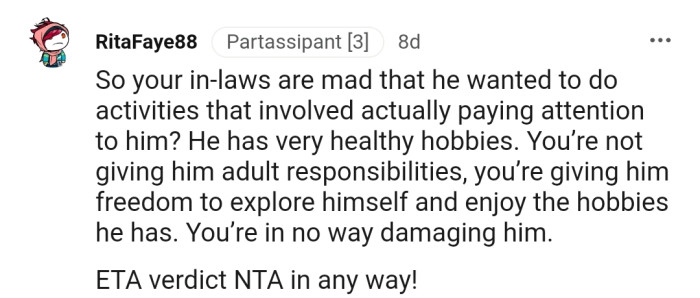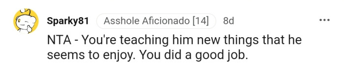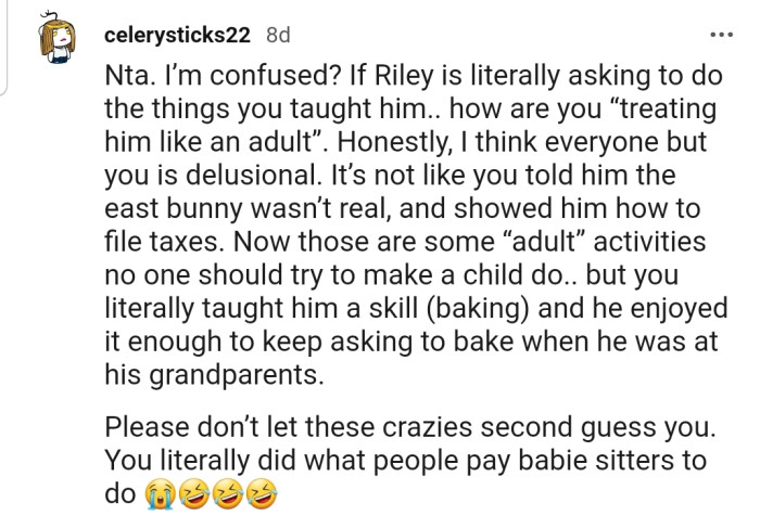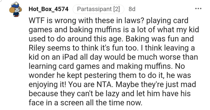 Reddit.comOP decided to teach Riley how to bake, play card games, and engage in board games, etc. However, now her husband and OP's in-laws are unhappy with her because they claim she's treating him like an adult.