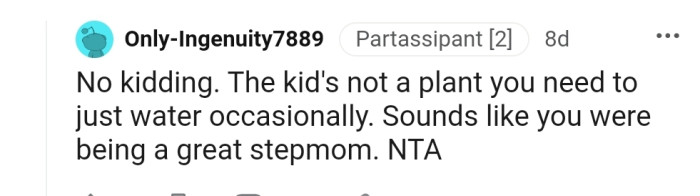 We found a story on the AITA subreddit that illustrates a similar situation. OP shared that she had recently taken over the care of her stepson because her husband’s job had taken him away from home for a month.