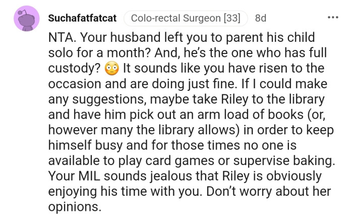 "Your MIL sounds jealous that Riley is obviously enjoying his time with you. Don’t worry about her opinions."
