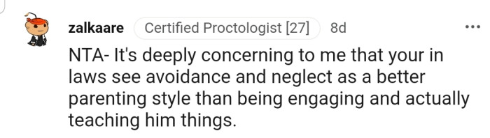 "Your in-laws see avoidance and neglect as a better parenting style than being engaging and actually teaching him things."