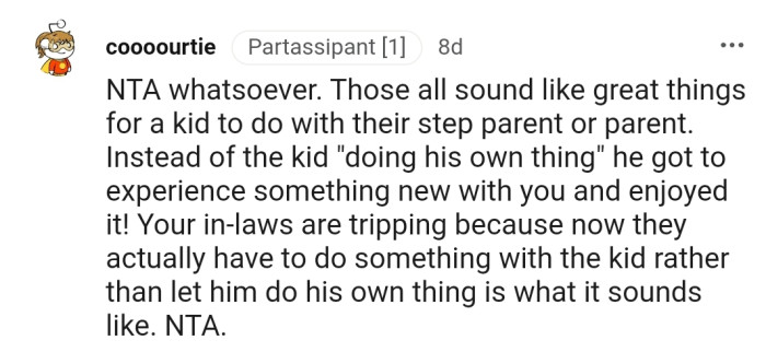 The commenters are flabbergasted at OP’s husband’s and in-laws’ reactions. They can’t believe they are upset that OP taught her stepson some interesting skills he might need in the future.