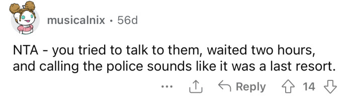 What's your take on this situation? Do you think the OP and her husband were out of line for calling the police, or would you have done the same under the circumstances?