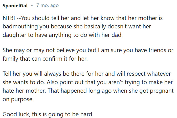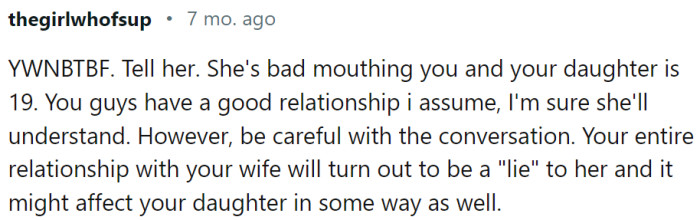 It's clear that the man is caught between a rock and a hard place. On one hand, his wife is already smearing his reputation to his daughter.