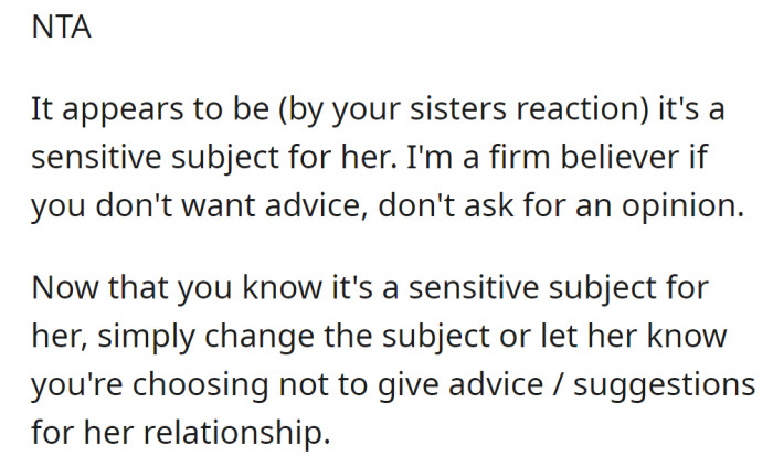 Redditors told the OP that she was not in the wrong for telling her sister the truth. She clearly didn't want to hurt her but to help her.