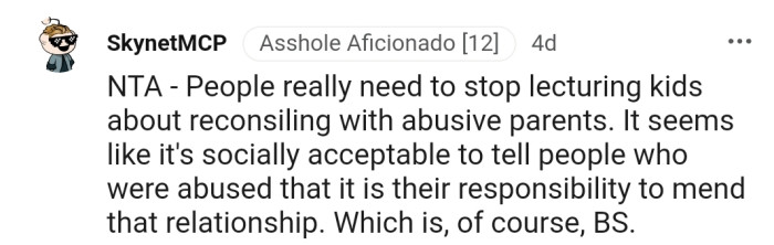 "NTA - People really need to stop lecturing kids about reconciling with abusive parents."
