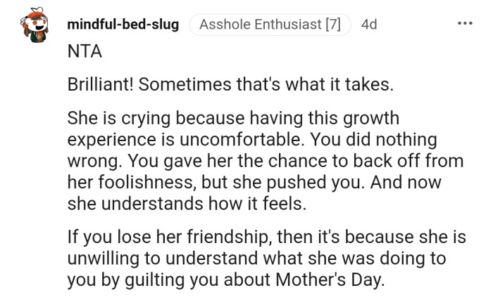 OP's friend, imbued with societal norms, implored her to reconnect with her mother on Mother's Day, turning a blind eye to the pain OP had explained to her time and again. This friend, a parent herself, tried to justify OP's mother's behavior with the excuse, "Parenting is hard," while also telling OP to "let bygones be bygones."