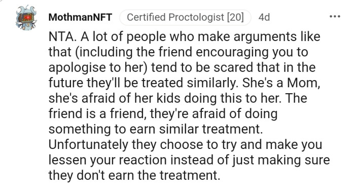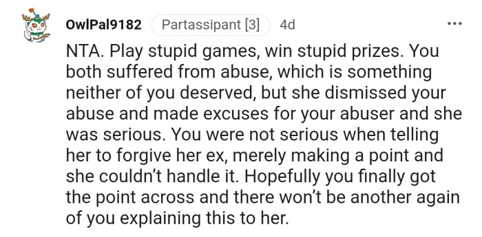 OP decided to turn the tables, using an analogy from her friend's own life, highlighting the absurdity of blaming the victim for the abuser's actions. While her words may have come across as harsh, they carried a significant message about the responsibility that comes with parenthood and the inherent wrongness of abuse, no matter who perpetrates it.