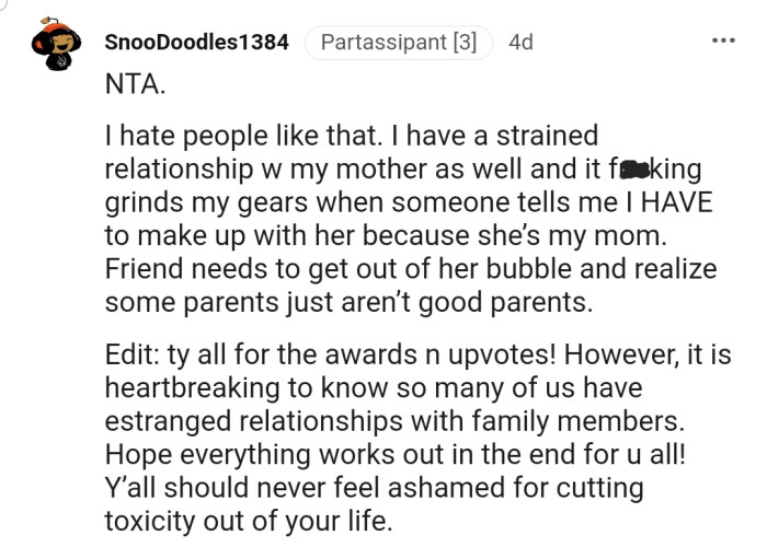 "I have a strained relationship with my mother as well, and it f**king grinds my gears when someone tells me I HAVE to make up with her because she’s my mom."