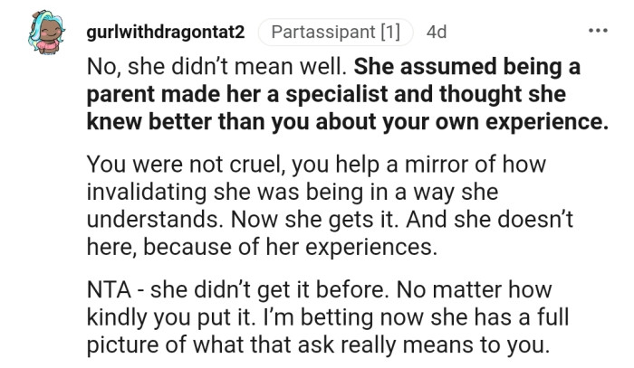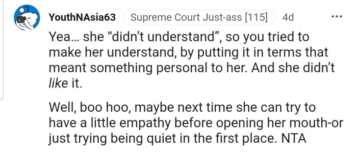 "Well, boo hoo, maybe next time she can try to have a little empathy before opening her mouth—or just try being quiet in the first place. NTA"