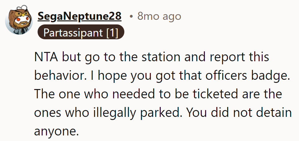 However, this standoff escalated to the point where the police were called, and surprisingly, they didn't support him. They didn't even issue a ticket to the person who was clearly in the wrong.