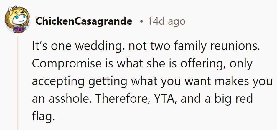 This situation illustrates the challenges of navigating family dynamics during significant life events. It's essential for couples to approach these discussions with empathy and understanding, recognizing the emotional stakes for both families.