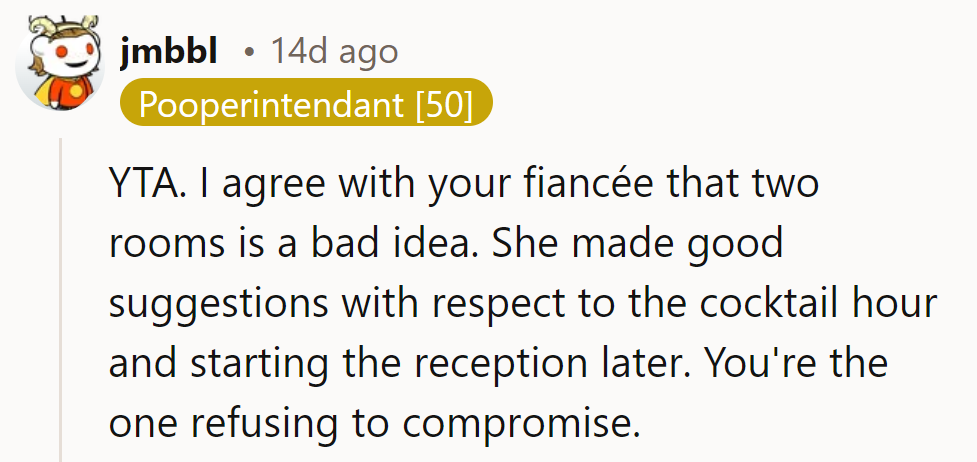 To address this, he proposes finding a venue with two separate rooms, allowing each family to celebrate in a style that feels most comfortable to them, yet still within the same location to facilitate mingling. However, his fiancée is not pleased with this idea.