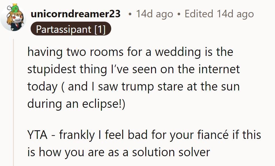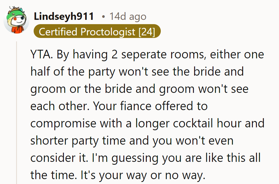 At weddings, the aisle isn't just for walking—it's a tightrope of family expectations. This groom's idea of separate reception rooms might just have added a safety net, but it seems his bride-to-be would rather they perform the balancing act together, no nets allowed! Love, after all, is about taking the leap.