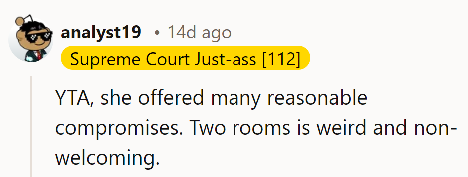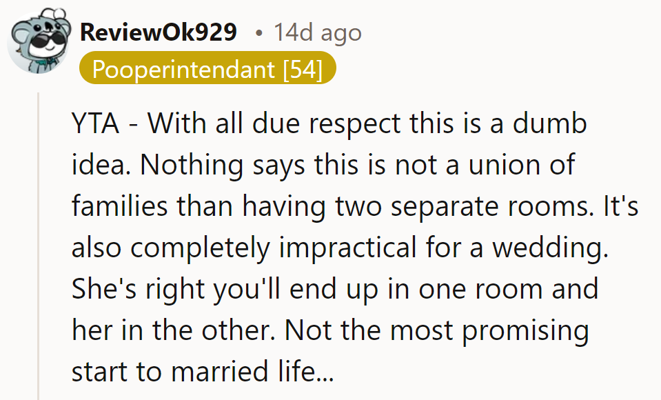 She believes that having separate rooms contradicts the very essence of a wedding, which is to symbolize the union of their lives and families. Her reaction underscores the importance of finding a middle ground that honors the preferences of both families while maintaining the unity that a wedding is supposed to celebrate.