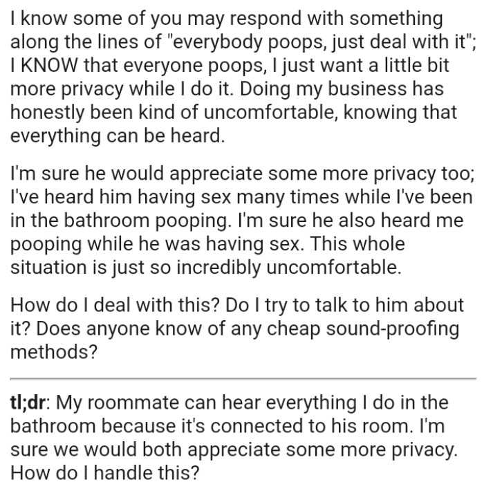 For the OP of today's story, she needed complete privacy to do her business in the bathroom, but she didn't have that. The problem is that there is absolutely no soundproofing between the OP's roommate's room and the bathroom.