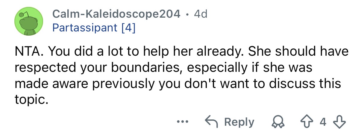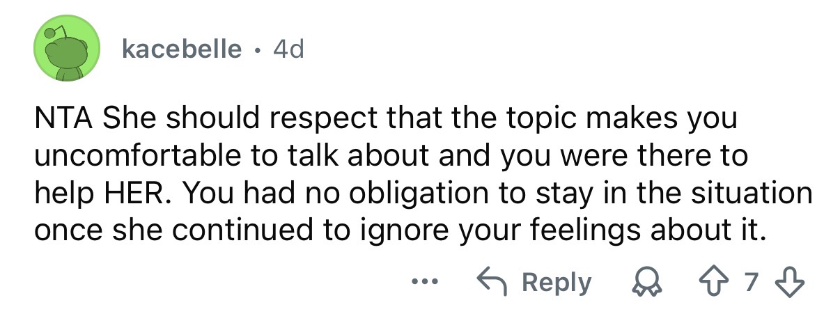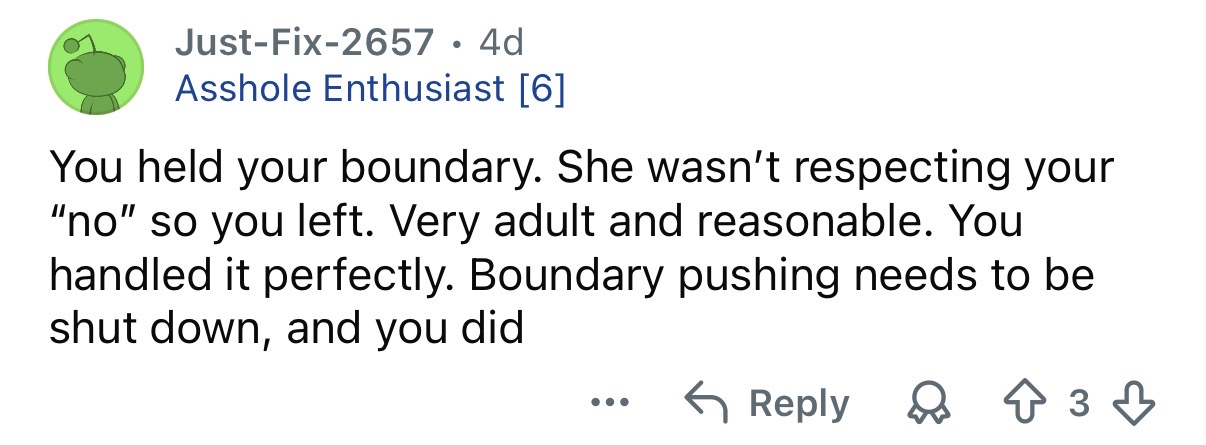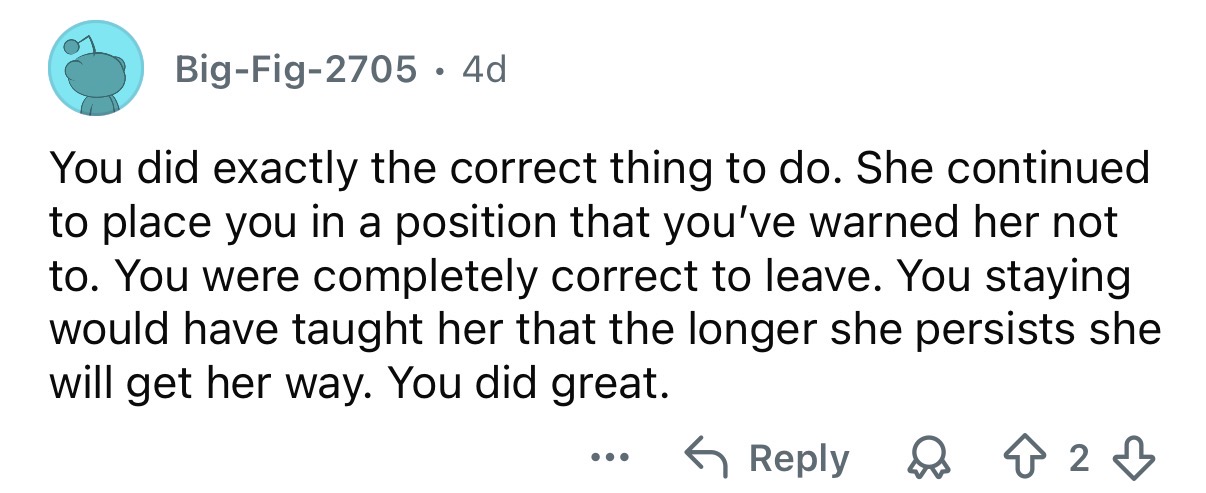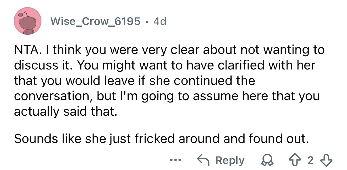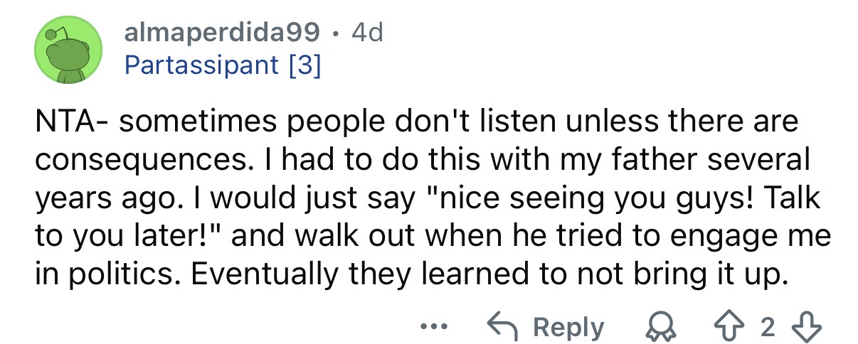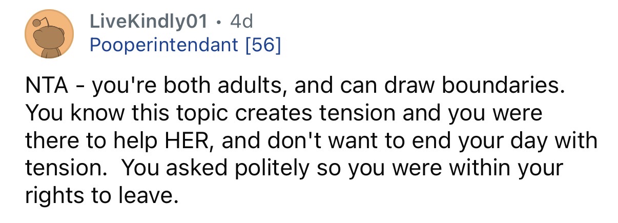 Despite two polite requests to drop the subject, the conversation escalated. The daughter felt disrespected and uncomfortable. So, she did what she felt was best for her mental health and left.
