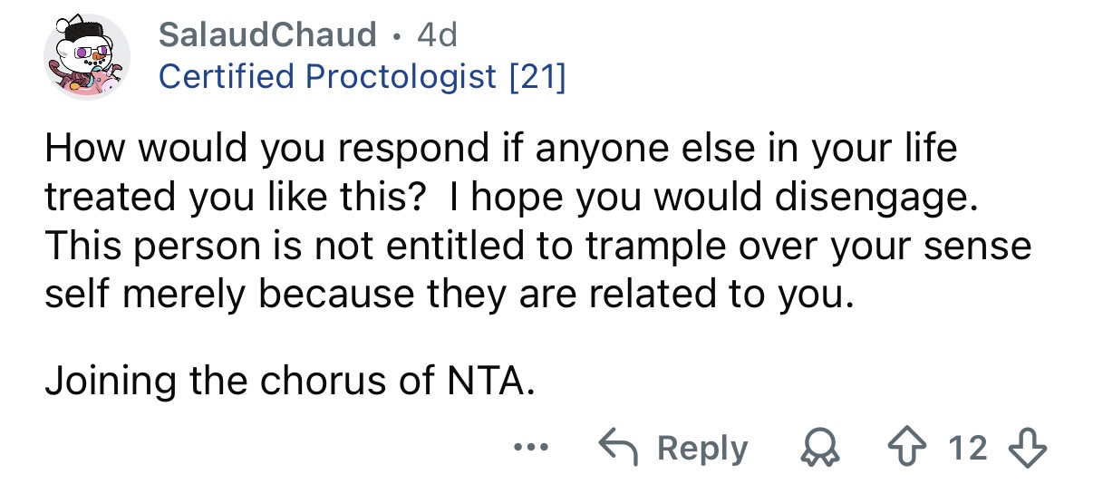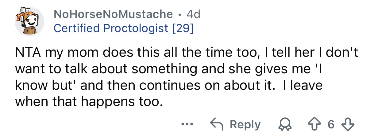 Then, out of nowhere, her mom brought up a semi-political topic they had clashed over before. The daughter calmly asked her mom to steer clear of the conversation, but her mom insisted on finishing her point. Cue the tension.
