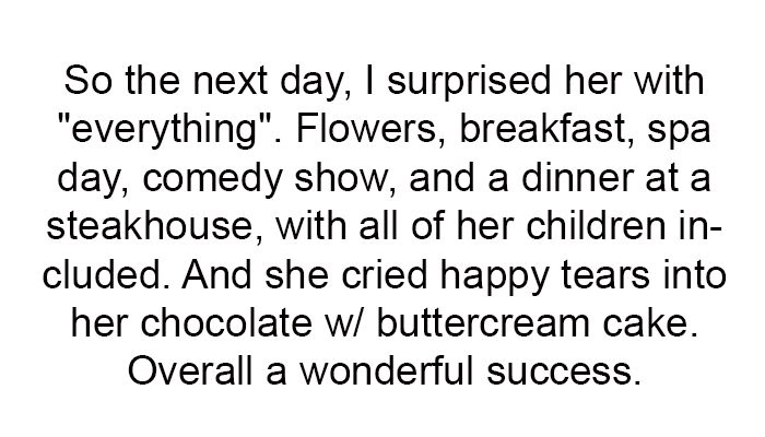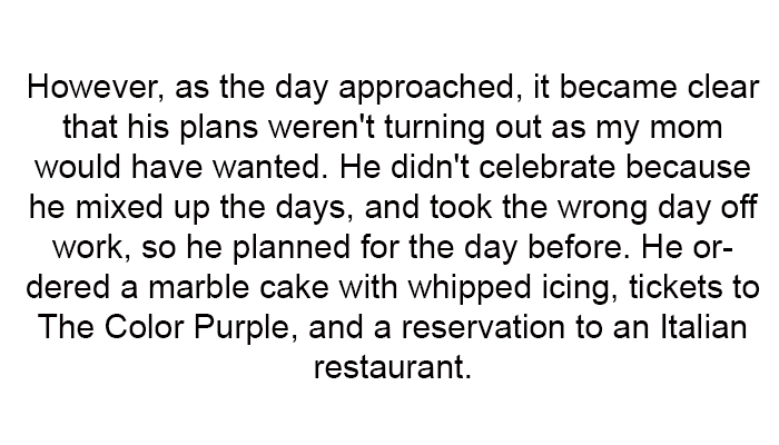 Despite his determination, the plans missed the mark, featuring the wrong cake, an unenjoyable musical, and an Italian dinner instead of the beloved steak and lobster. Observing the unfolding disaster and her mother’s inevitable disappointment, she discreetly prepared a backup celebration that delivered everything her mother truly loved, culminating in tears of joy.
