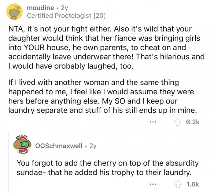 Reddit: r/AmItheA**holeOP's daughter found women's underwear in the laundry and suspected her fiancé was cheating.