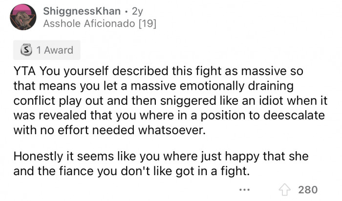 "...you let a massive emotionally draining conflict play out and then sniggered like an idiot..."