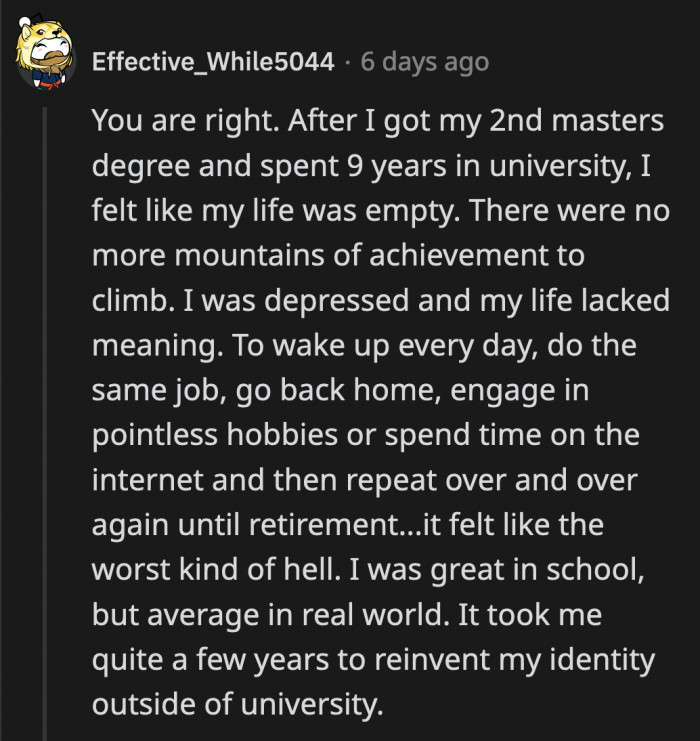 She thrives on the validation she is getting from university, which isn't always present in the working adult world. There is no promise of a reward when you do a great job, unlike in the school system where hard work is rewarded with grades and praise.