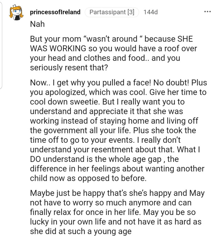 Regardless, the commenters urged OP to support their mother's decision to have a baby. The passage of time had brought about change, and it was evident that happiness and fulfillment were at the heart of their mother's desire.