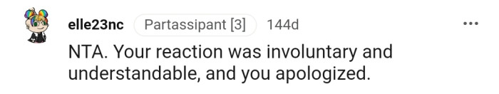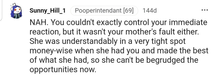 "NAH. You couldn't exactly control your immediate reaction, but it wasn't your mother's fault either."
