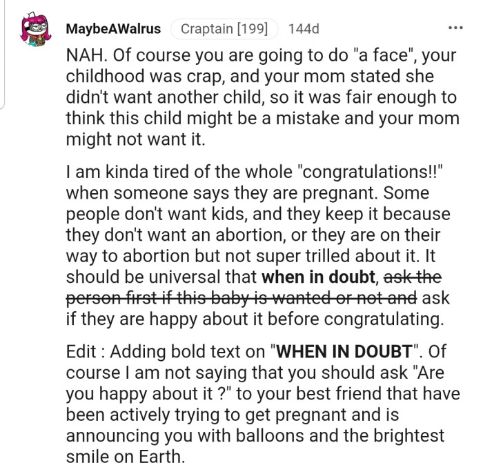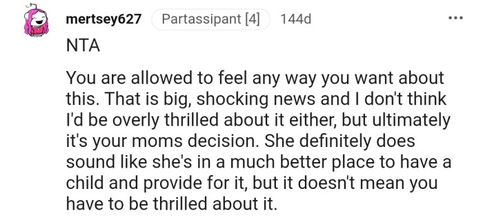 Considering their mother's age (40) and previous statements about not wanting another child, it was a lot to process. Yet, OP had come to realize that things had changed, and it was crucial to acknowledge the growth and transformation that their mother had undergone.