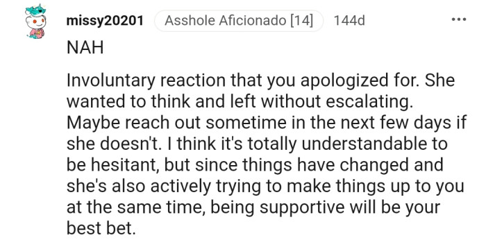 "NAH...Involuntary reaction that you apologized for. She wanted to think and left without escalating."