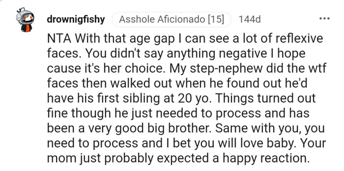 As the Reddit community weighed in on the matter, it became clear that OP's reflexive reaction was understandable to many. The age gap and the fact that their mother was opposed to having another child shaped their initial response to the news of her pregnancy.