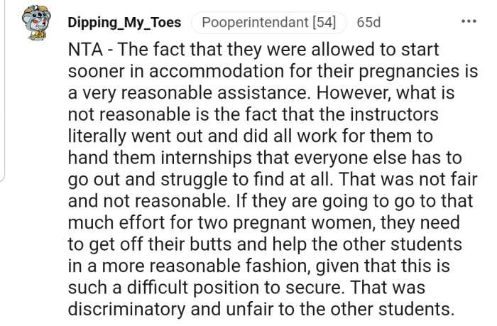 Reddit.comTwo of OP's pregnant colleagues were handed placements on a platter by their instructors because they were pregnant. This got OP upset, especially when one of them tried defending their instructors for not helping others